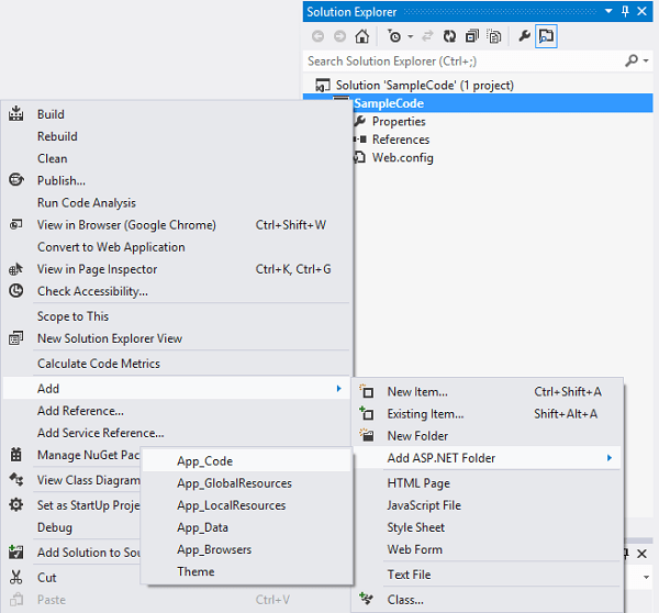 Now, I am going to add the App_Code folder to my project because I want to create a helper class for organization reasons. To add this folder, right click on the project name (SampleCode) in the Solution Explorer window and navigate to Add -> Add ASP.NET Folder -> App_Code.