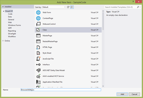 To add the class, right click on the App_Code folder you’ve just created and navigate to Add -> Class… I’ll go ahead and name this class BrowserUtility.cs and click on the Add button.