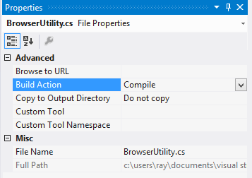 To make sure this class gets compiled into an assembly that I can use later, I’ll highlight the BrowserUtility.cs file under the App_Code folder, and in the Properties window, I will change the Build Action from Content to Compile.