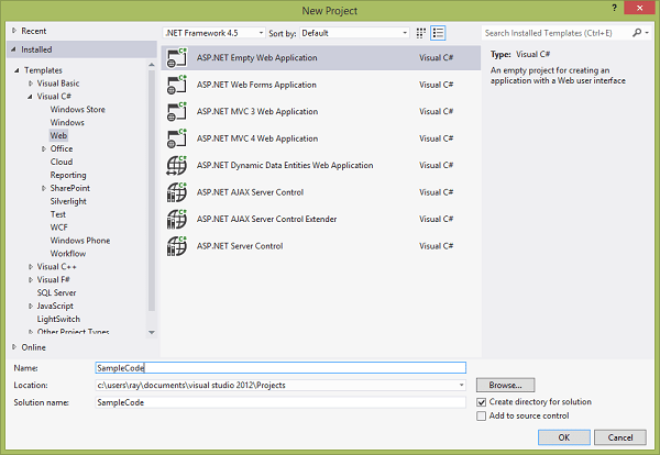 Next, I will select Templates -> Visual C# -> Web -> ASP.NET Empty Web Application and name the project SampleCode. I will also check the option to Create a directory for solution and hit the OK button to continue.